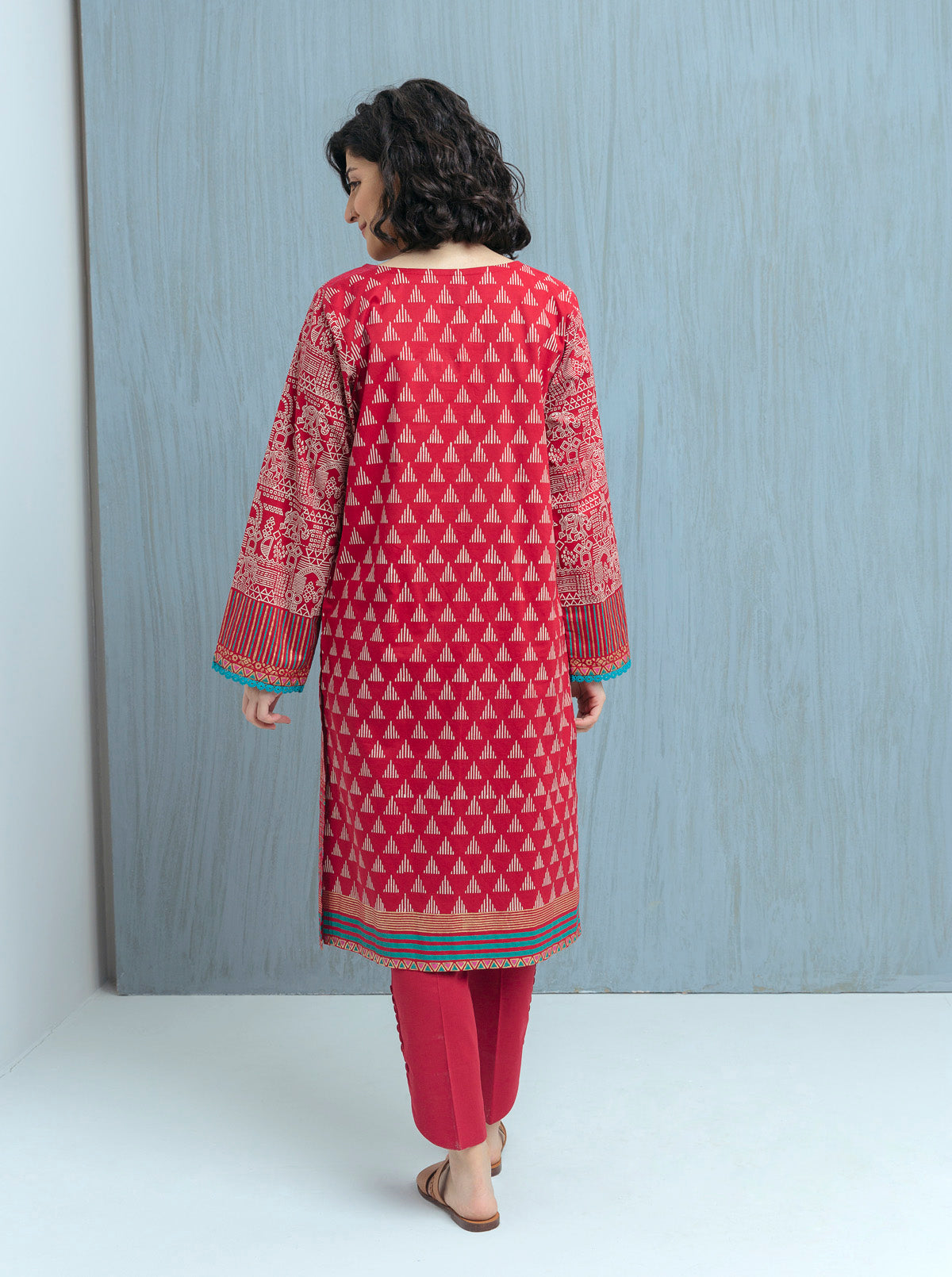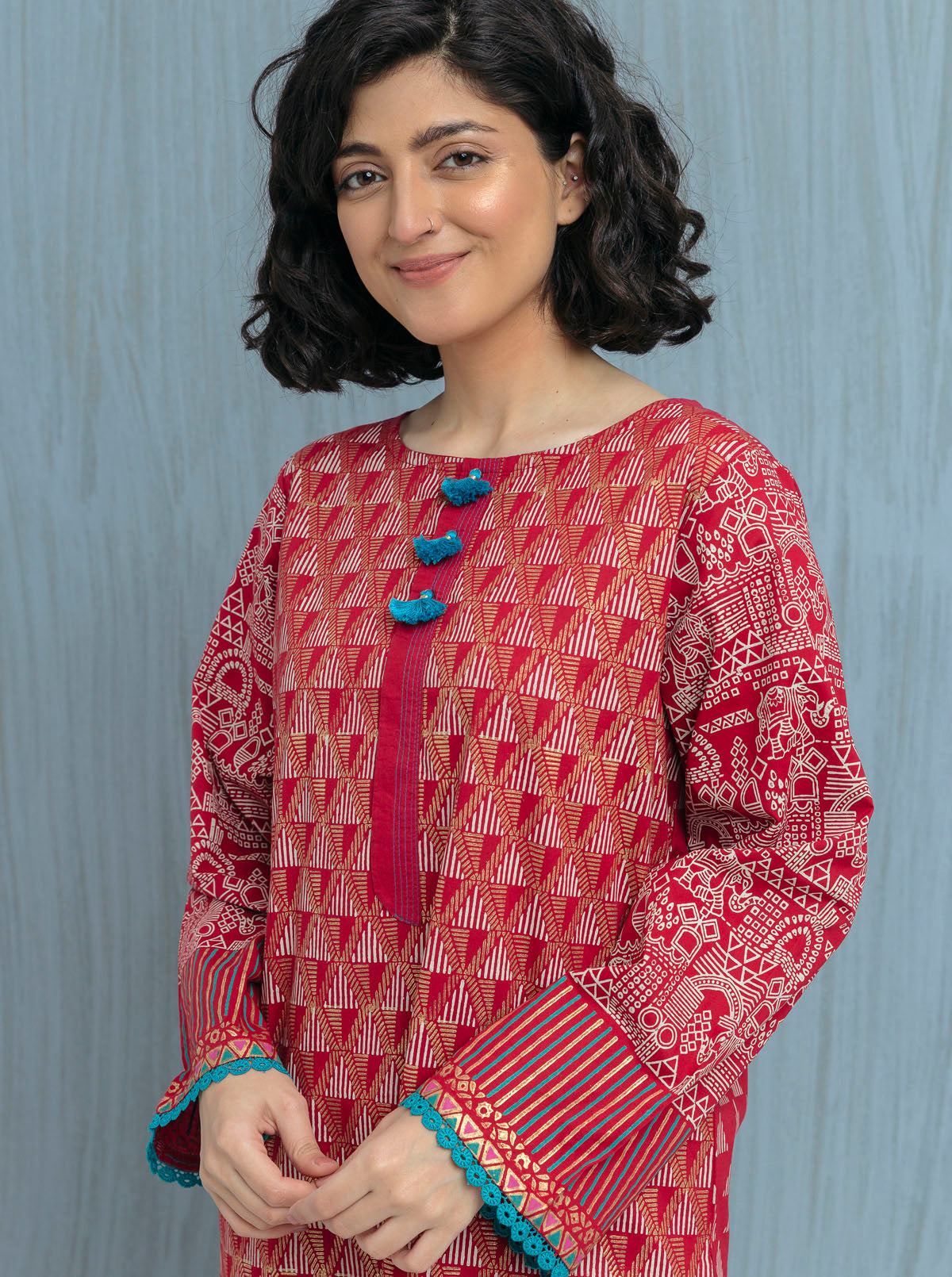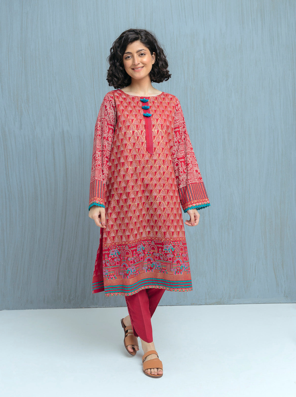 Artisan Collection Full Front Gold Block Print With Contrast Colour Border On Front. Full Block Print On Sleeves. Fabric: Lawn
