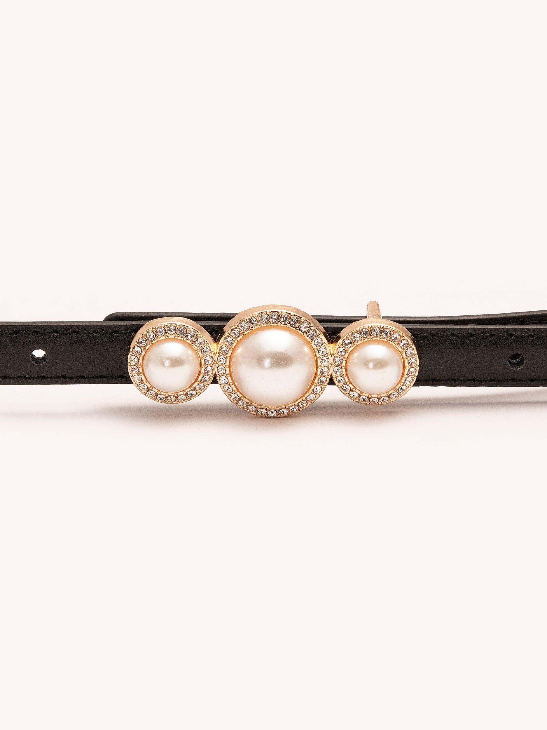 - Buckle decorated with pearls and rhinestones