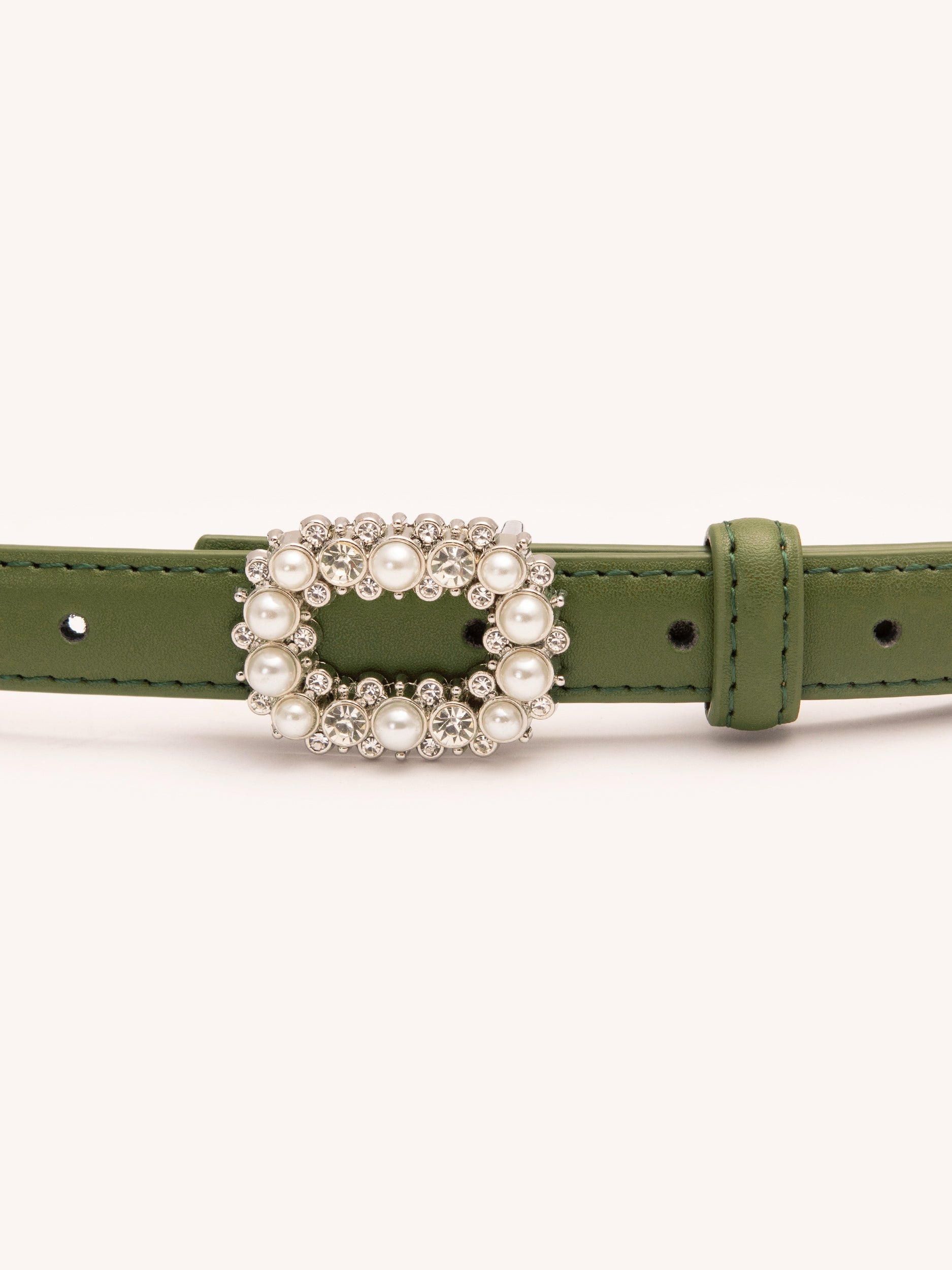 - Buckle embellished with rhinestones and pearls
